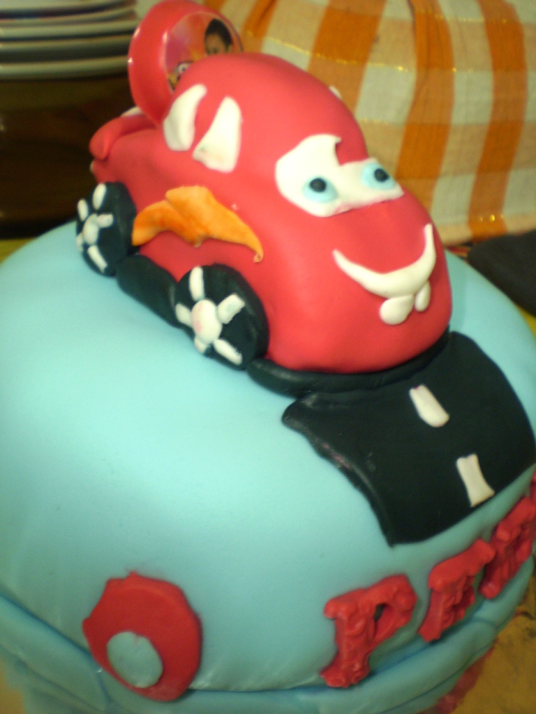 Nah setelah selesai, seluruh permukaan cake dioles buttercream, kemudian dicover fondant merah. Kemudian tinggal tambah asesorisnya deh, aku gak pake edible image, jadi mata, roda, dan lainnya dari fondant, benar-benar so simple.